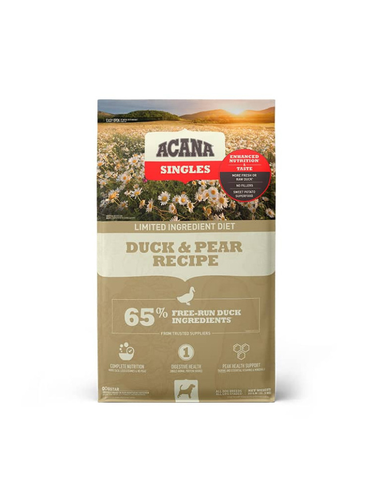 Con un 65% de pato Muscovy para nutrir a tu perro de acuerdo a sus necesidades evolutivas, ACANA Duck & Pear contiene una sola proteína animal de fácil digestión.