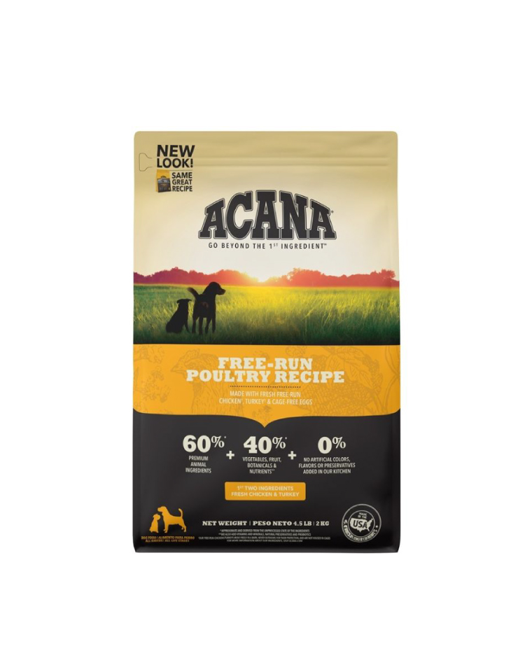 Acana Free Run Poultry Por eso nuestra receta de aves de corral ACANA Free-Run para perros está cuidadosamente equilibrada con ingredientes animales ricos en proteínas 60% como pollo y pavo libre, y huevos frescos, y 40% de verduras, frutas y nutrientes saludables. Cada comida también ayuda a apoyar 4 beneficios clave para la salud de su perro, incluyendo Salud Digestiva, Sansa y Coat, Salud en la Salud y Peso Saludo. Alimenta a tu perro con una receta deliciosa y nutritiva que los deja sintiéndose tan bien por dentro,y por fuera.