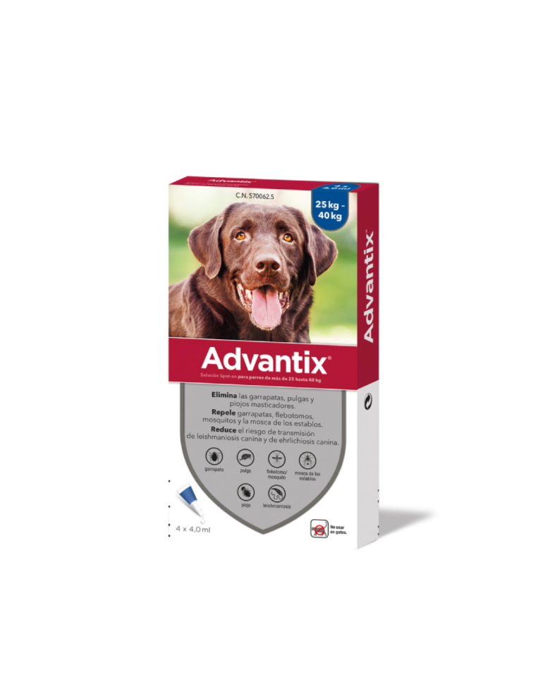 aAdvantix Pipeta Perro 25-40kg es una pipeta de aplicación spot on únicamente para perros. Está indicado para la prevención y tratamiento de infestaciones por pulgas (Ctenocephalides canis, Ctenocephalides felis) y también para el tratamiento de las infestaciones por piojos masticadores (Trichodectes canis).