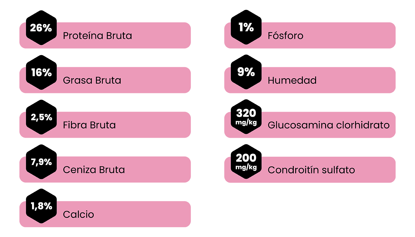 Carne deshidratada 36 % (pollo 14 %), arroz 27 % (arroz integral 15 %), guisantes 12 %, grasa de ave 12 %, harina de algarroba 2 %, pulpa de remolacha 2 %, proteína animal hidrolizada, vitaminas y minerales, levadura y extracto de levadura-Saccharomyces cerevisiae (fuente de mananooligosacáridos – MOS y β-glucanos), aceite de salmón (fuente de ácidos grasos omega-3), fibra dietética insoluble de guisante, inulina (fibra soluble de achicoria, fuente fosfooligosacáridos – FOS), salvia hispánica (fuente de ácidos grasos omega-3 y fibra dietética), algas (Ascophyllum nodosum), hidrolizado de crustáceos (fuente de glucosamina), hidrolizado de cartílago (fuente de Condroitina), aceites esenciales (orégano, canela, clavo, tomillo, romero, hierbabuena, té verde), yucca.