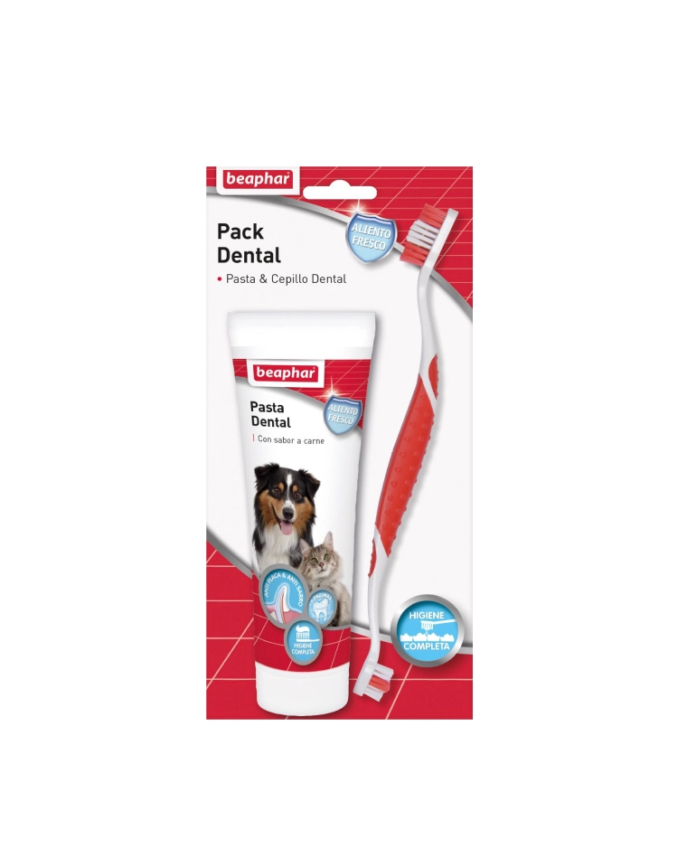 Beaphar Kit Cepillo de Dientes+Pasta Dental está formulada para perros y gatos a partir de las sustancias minerales de Tripolifosfato de sodio que evitan que la placa dental se convierta, mediante acumulación de calcio, en sarro.