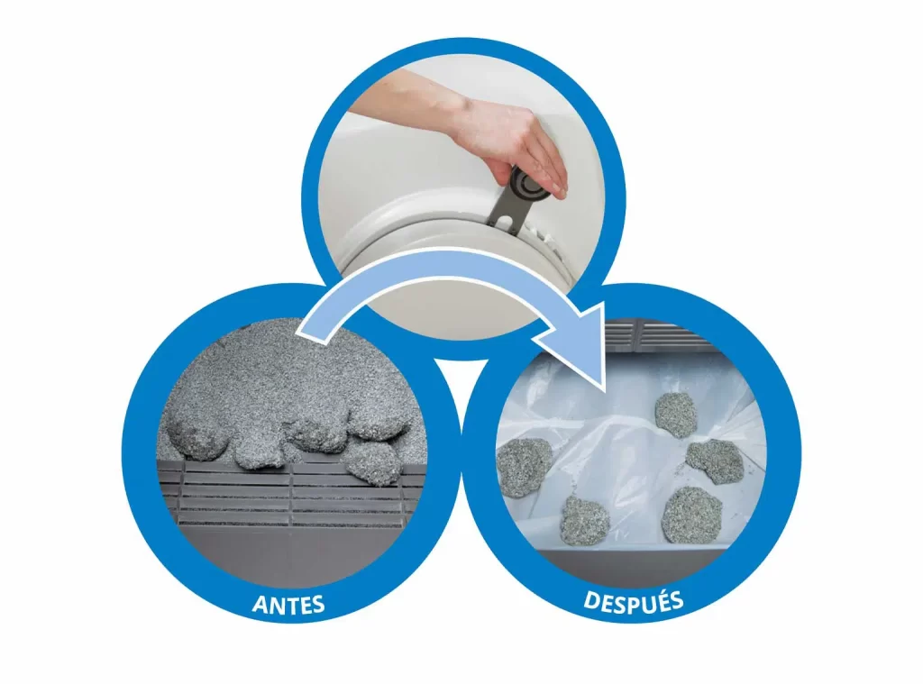 Arenero autolimpiable con una práctica palanca para eliminar los residuos
