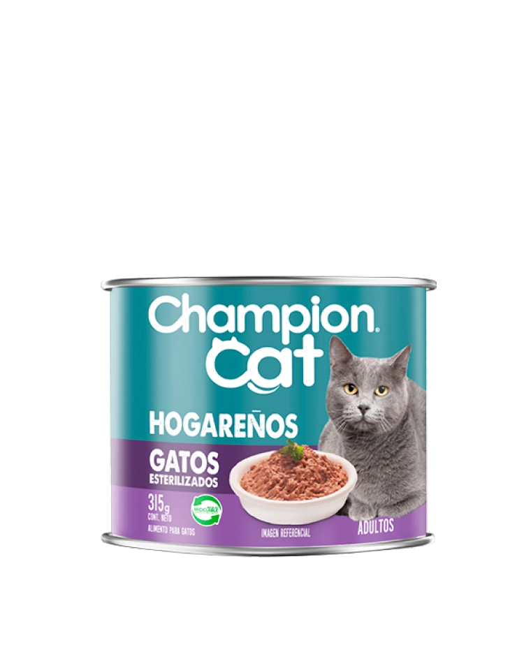 Champion Cat Lata Hogareños para gatos esterilizados con salmón. El nuevo Champion Cat Hogareños Recetas de Paté es un alimento especialmente formulado para gatos esterilizados o que viven a interior del hogar, ayudando a controlar su peso y las molestas bolas de pelos; y con un exquisito sabor a Salmón para deleitar su exigente paladar.