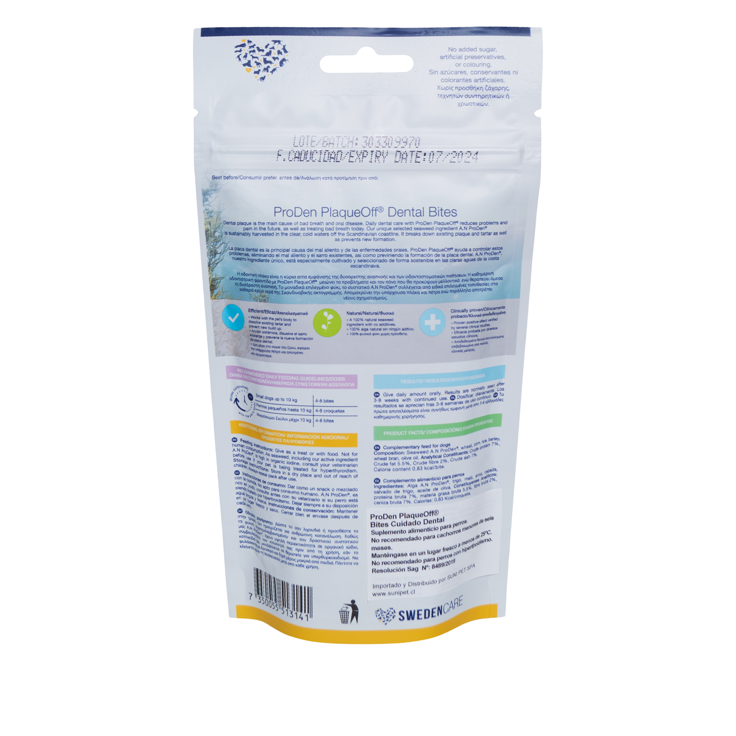PlaqueOff ProDen Snack Dental S tiene como principal ingrediente un alga especialmente seleccionada, que ha demostrado en ensayos clínicos, su efectividad para reducir la acumulación de placa, la formación de sarro y el mal aliento y viene en un formato muy fácil de administrar. ProDen Plaqueoff® es único ya que actúa desde el interior. Sin azucares añadidos, ni aditivos, conservantes ni colorantes artificiales. Es un producto 100% natural.